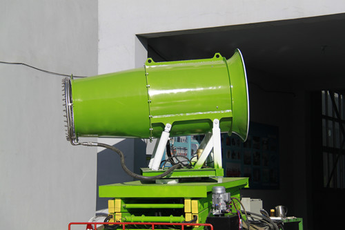 霧炮機是采用高壓水泵供水,通過(guò)水管將水送入噴霧機的噴頭處,由水泵產(chǎn)生的壓力在通過(guò)特制的噴頭將水產(chǎn)生顆粒較大的霧狀;然后由高速運轉的電動(dòng)機帶動(dòng)風(fēng)扇,產(chǎn)生高速流動(dòng)的氣流,將水霧送出去。將顆粒較大的水霧通過(guò)高速的氣流,進(jìn)一步撕裂成更細小更輕的水霧,并輸送出去。